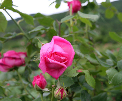 蔷薇科Rosaceae,蔷薇属Rosa,丛生灌木植物(有刺,直立),百叶玫瑰(R.centifolia),又称法国千叶、千叶玫瑰、格拉斯玫瑰、摩洛哥玫瑰。原产于法国格拉斯地区,是提取玫瑰精油和生产玫瑰露的上佳品种。